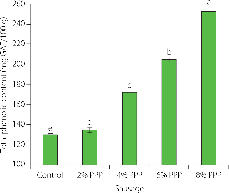 Total phenolic content of chicken sausages with different levels of prickly pear peel (PPP) powder (2–8% of the total meat batter, w/w). Data are presented as the mean and standard deviation of three independent measurements. Different letters above the columns indicate significant differences at p<0.05. GAE, gallic acid equivalent.