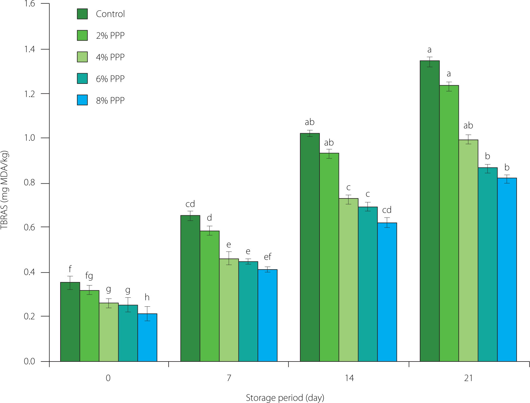 Thiobarbituric acid reactive substance (TBARS) values of chicken sausages with different levels of prickly pear peel (PPP) powder (2–8% of the total meat batter, w/w) during storage. Data are presented as the mean and standard deviation of three independent measurements. Different letters above the columns indicate significant differences at p<0.05. MDA, malondialdehyde equivalent.