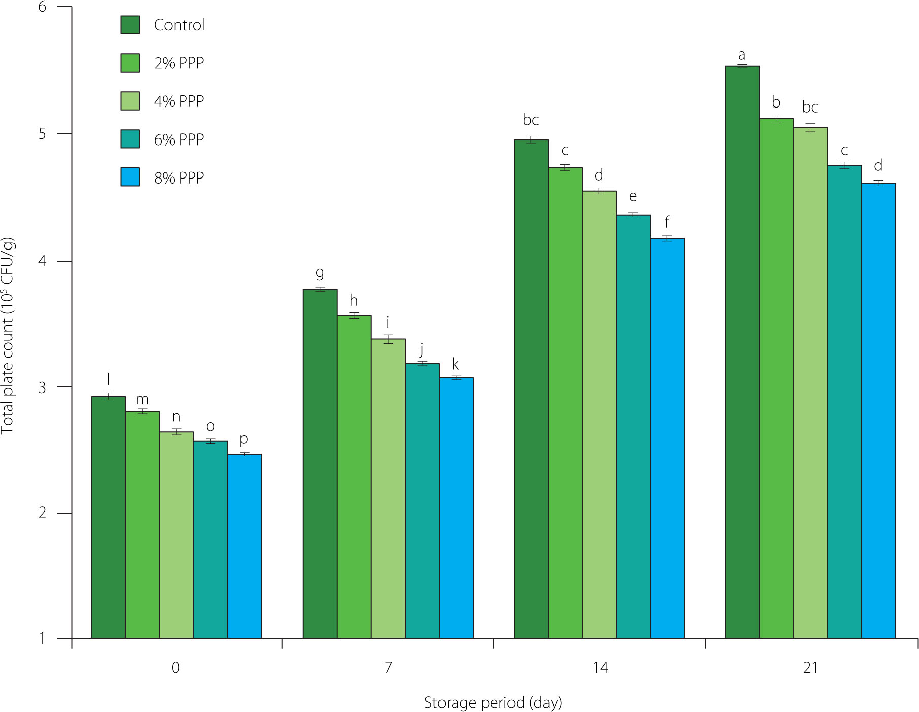 Total plate count of chicken sausages with different levels of prickly pear peel (PPP) powder (2–8% of the total meat batter, w/w) during storage. Data are presented as the mean and standard deviation of three independent measurements. Different letters above the columns indicate significant differences at p<0.05.