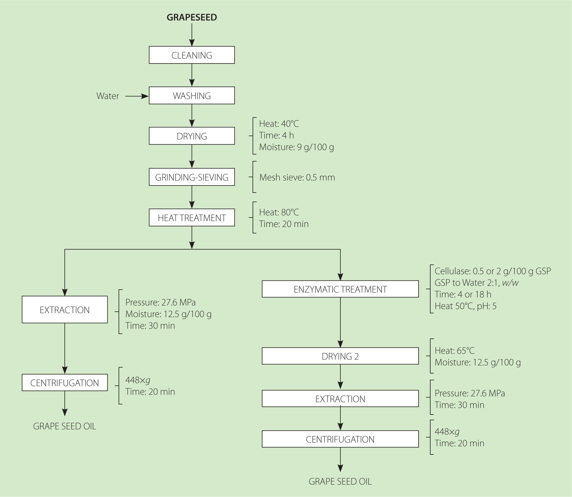 Process flow for obtaining grapeseed oil with and without cellulase treatment. GSP, grape seed powder.