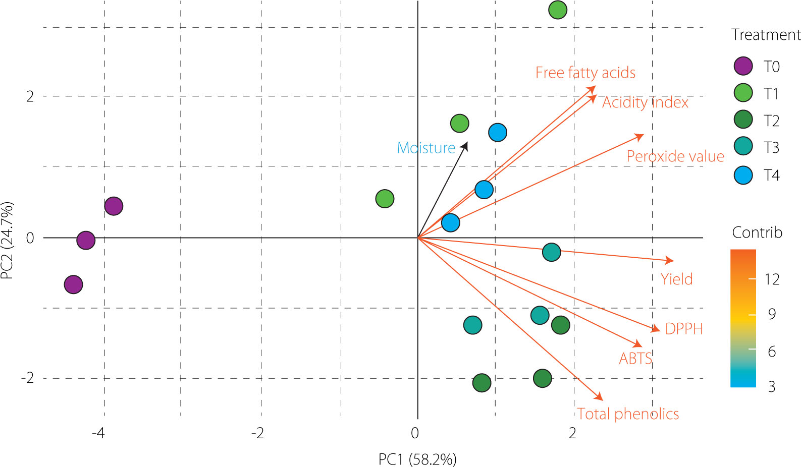 PCA was conducted using yield, moisture content, free fatty acid content, acidity index, peroxide value, total phenolic content, and results of ABTS and DPPH assays across treatments (T0–T4). The first two principal components explained 82.9% of the total variance (PC1: 58.2%, PC2: 24.7%), effectively summarizing most of the data variability. As shown in the biplot (Figure 2), yield, total phenolic content, and ABTS and DPPH results exhibited high loadings on PC1, forming a cluster associated with extraction efficiency and antioxidant capacity. In contrast, free fatty acids, acidity index, and peroxide value grouped in the opposite direction, reflecting indicators related to oil degradation. Moisture content, which contributed primarily to PC2, remained isolated from these clusters, indicating a secondary and independent effect on the dataset. These results highlight that PC1 differentiated treatments by functional enrichment, while PC2 captured compositional differences, consistent with previous studies on enzyme-assisted extraction of plant oils [Kaseke et al., 2021].