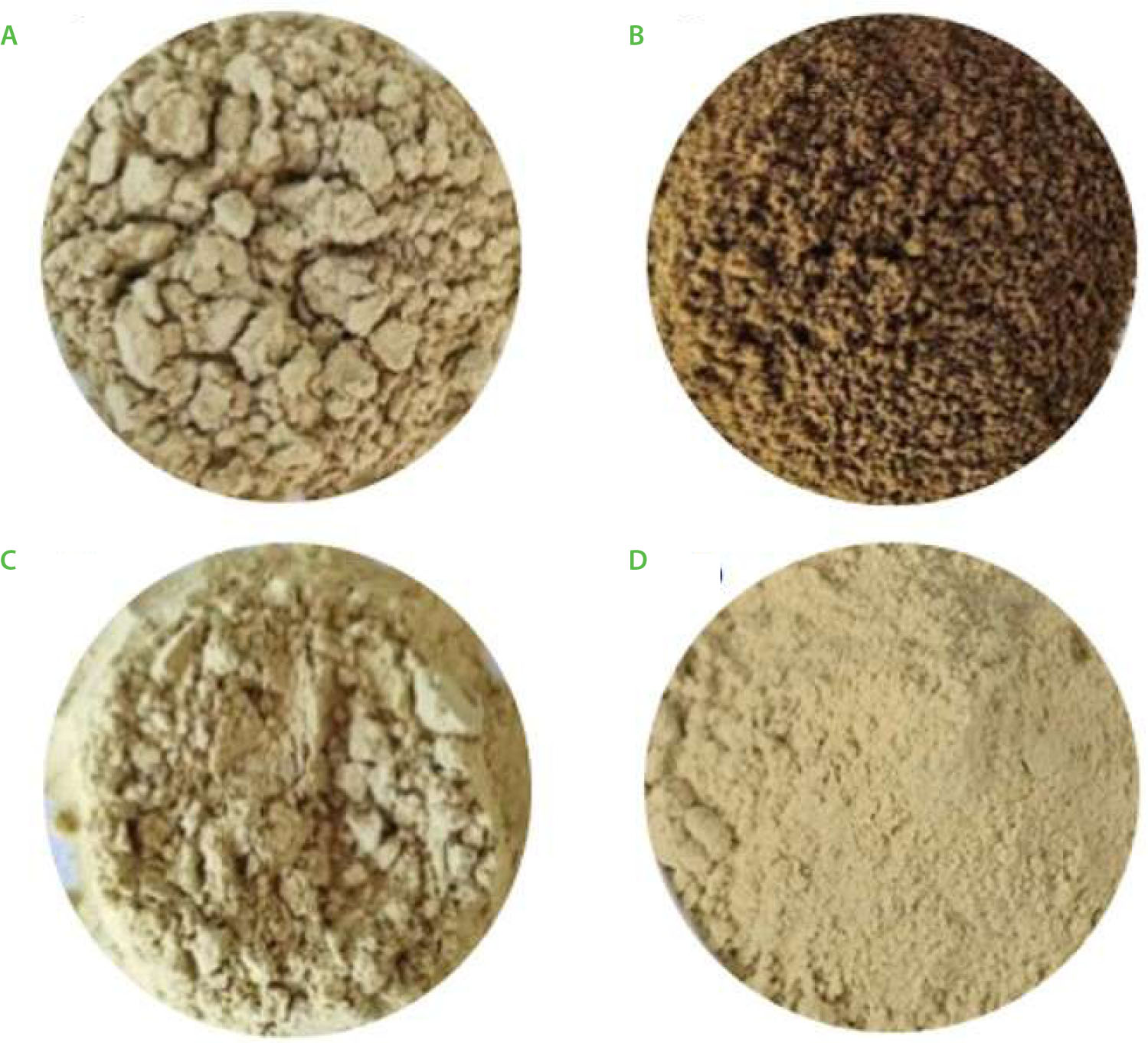 Appearance is one of the key indicators directly reflecting product quality. The Tbb appearance before and after modifications is shown in Figure 1. The unmodified Tartary buckwheat bran (Figure 1A) appeared coarse in texture, yellowish in color, and tended to clump into large aggregates. After modification, the extruded bran became dark brown due to exposure to high temperature and pressure, with larger particles and a more coarse, fluffy texture (Figure 1B). In contrast, Tbb modified by fermentation appeared lighter in color and more loosely structured compared to the unmodified version (Figure 1C). The superfine ground Tbb had a brighter and more uniform color, and also finer and more delicate particles (Figure 1D).
