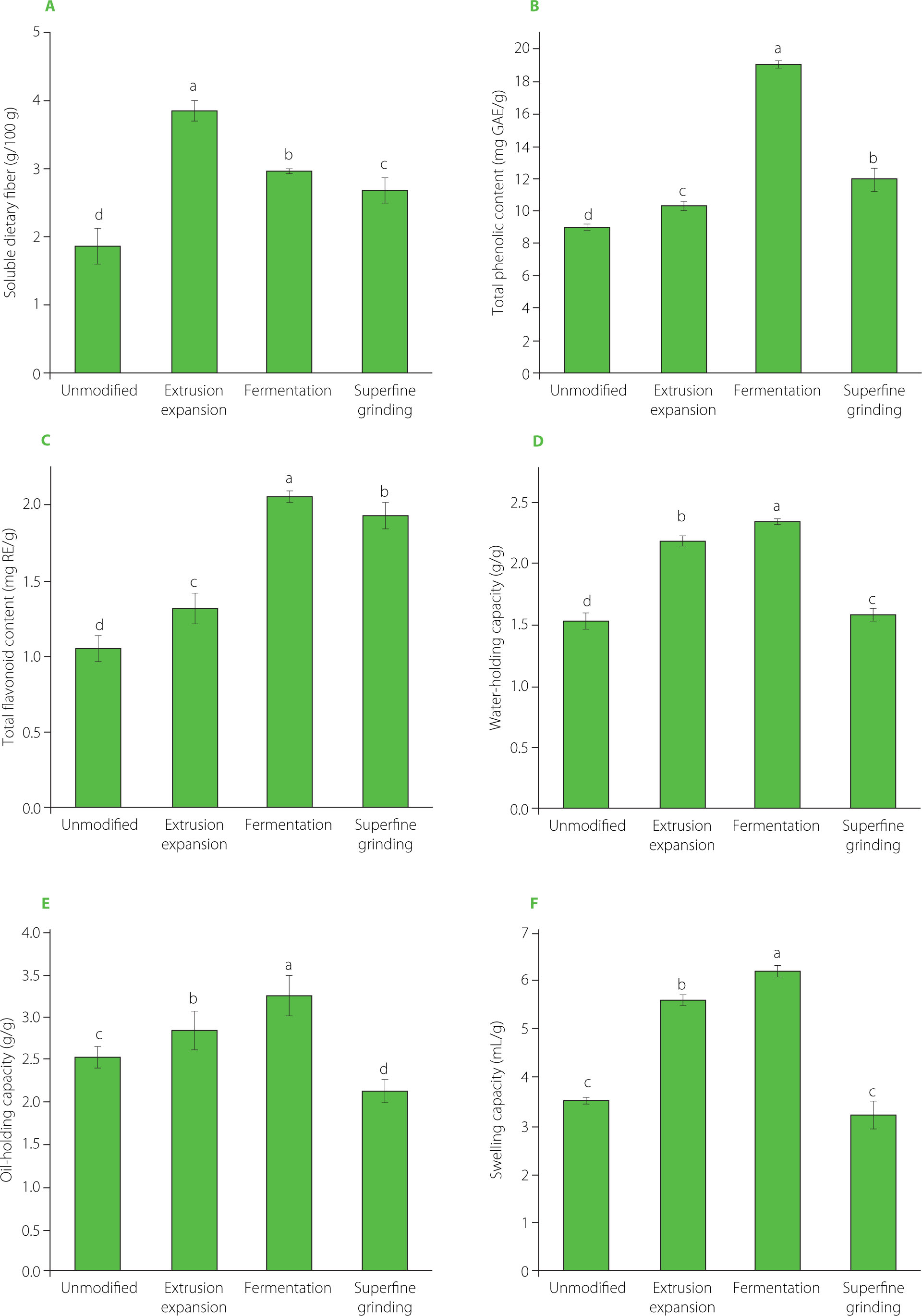 Soluble dietary fiber content (A), total phenolic content (B), total flavonoid content (C), water-holding capacity (D), oil-holding capacity (E), and swelling capacity (F) of unmodified and modified Tartary buckwheat bran. Different letters above the bars indicate significant differences (p<0.05). GAE, gallic acid equivalent; RE, rutin equivalent.