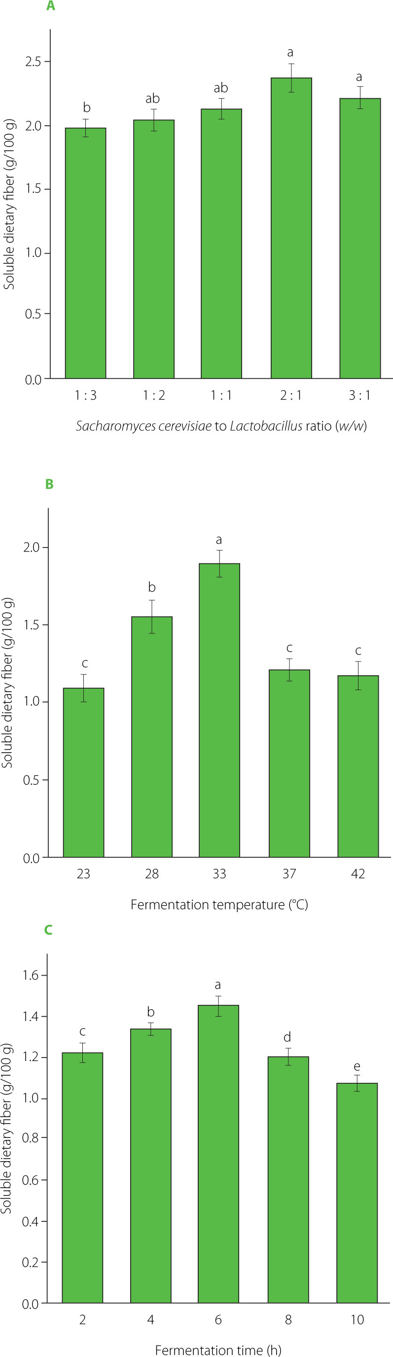 Soluble dietary fiber content of Tartary buckwheat bran powders fermented with different ratios of Saccharomyces cerevisiae to Lactobacillus as inoculation cultures (A), at different temperatures (B) and for different times (C). Different letters above the bars indicate significant differences (p<0.05).