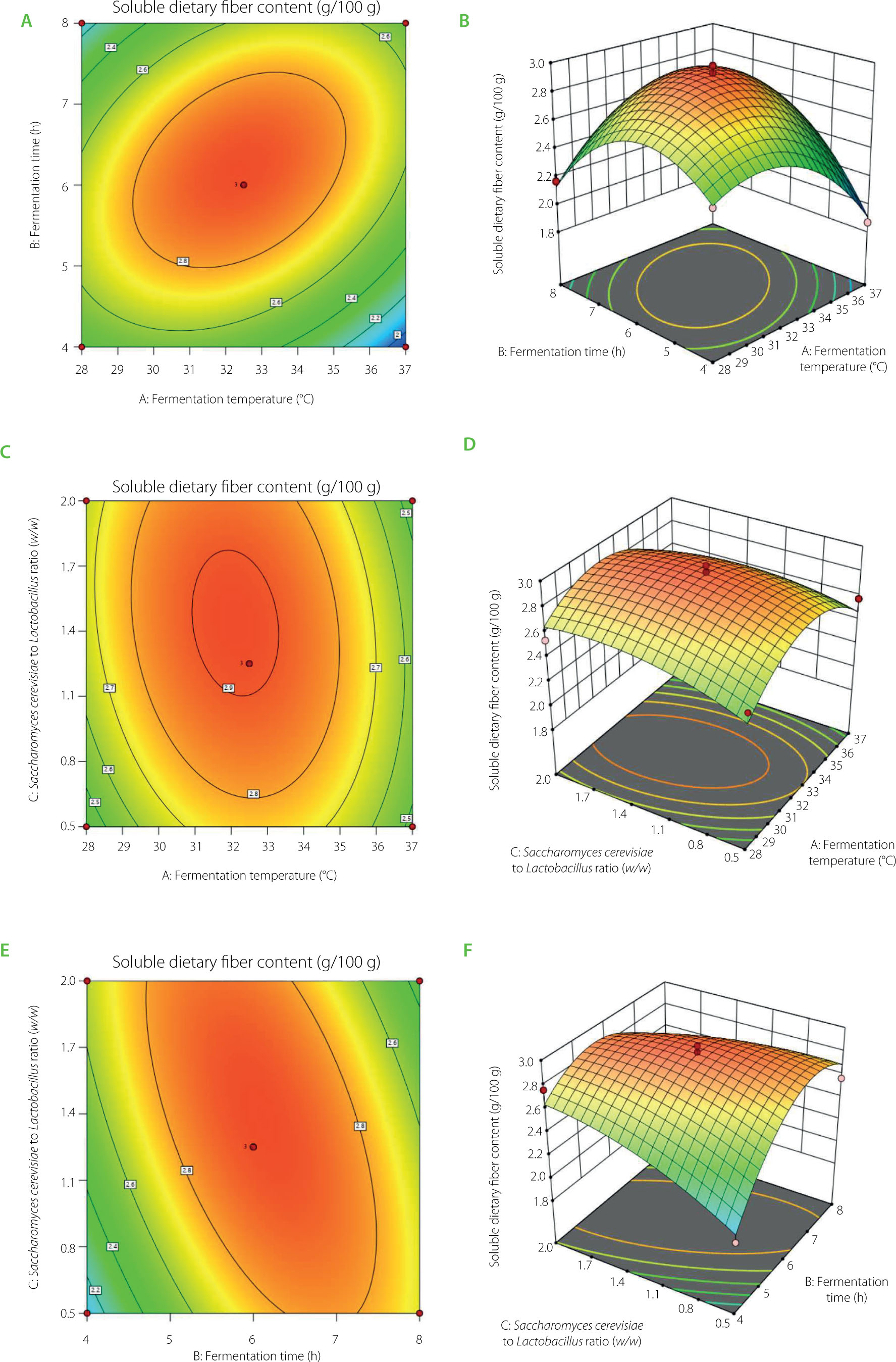 Contour (A, C, and E) and response surface (B, D, and F) plots showing the effect of interaction between fermentation temperature and fermentation time (A–B), fermentation temperature and Saccharomyces cerevisiae to Lactobacillus ratio (w/w) (C–D), and fermentation time and Saccharomyces cerevisiae to Lactobacillus ratio (w/w) (E–F) on the soluble dietary fiber content of Tartary buckwheat bran.