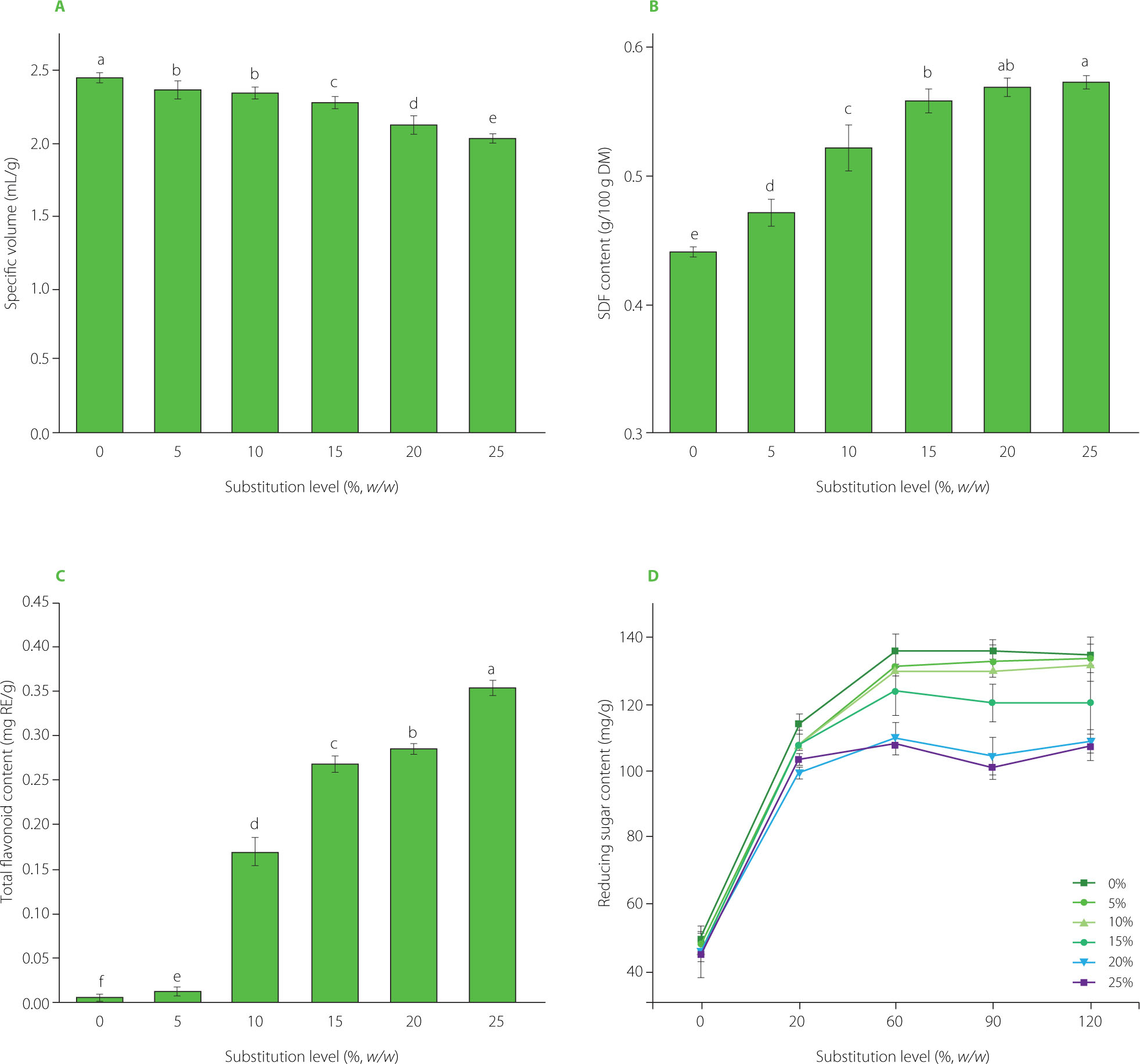 The specific volume (A), soluble dietary fiber (SDF) content (B), total flavonoid content (C), and digestive characteristic (D) of steamed bread produced with different substitution levels of wheat flour with fermented Tartary buckwheat bran powder. Different letters above the bars indicate significant differences (p<0.05). RE, rutin equivalent; DM, dry matter.