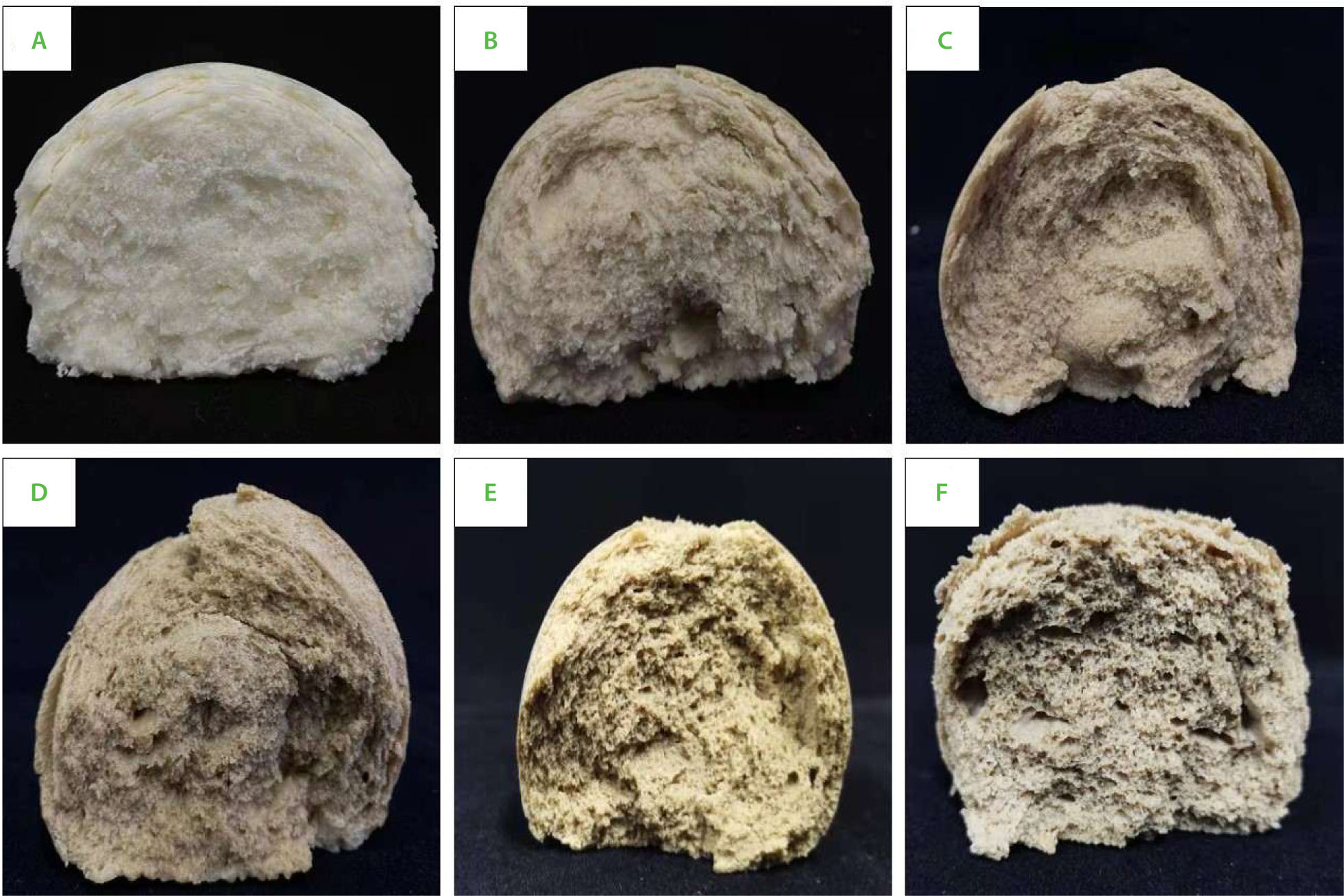 Specific volume is used to reflect the degree of dough volume expansion and retention ability, and is one of the important indicators of steamed bread quality evaluation. As shown in Figure 5A, the specific volume of steamed bread showed an overall decreasing trend with an increasing substitution level. This is consistent with the results of Zhang et al. [2021]. The observed changes might be caused by the fact that the addition of Tbb destroyed the stable gluten network structure in the wheat flour, and the expansion of the steamed bread embryo was blocked, which led to the reduction of steamed bread volume [Li et al., 2023].