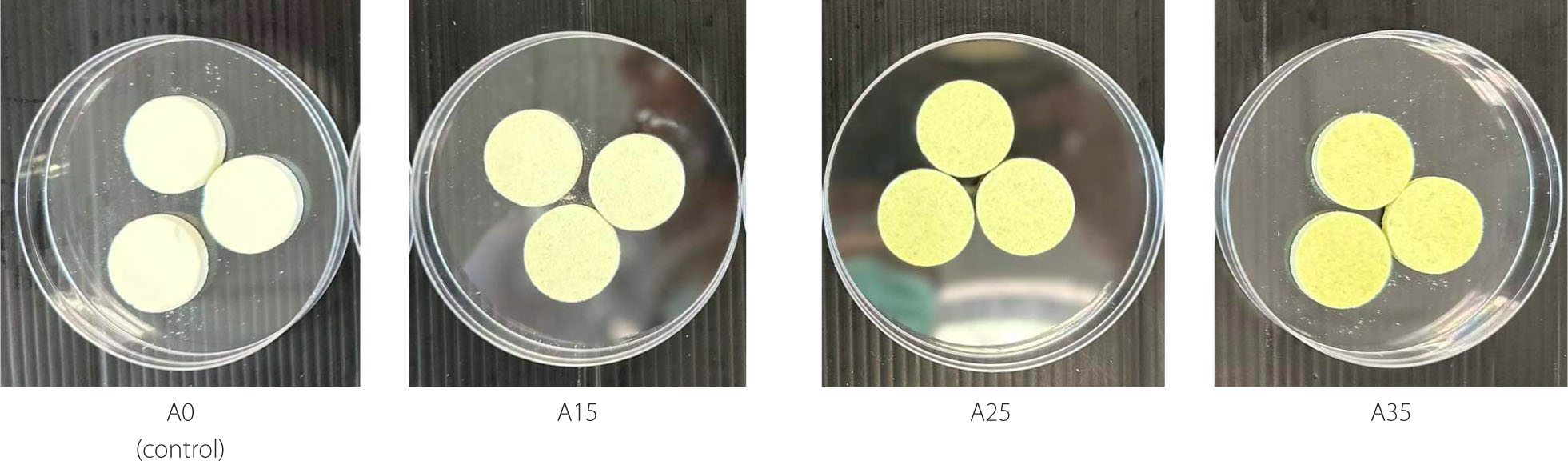 Images of milk tablets without (A0, control) and with 15% (A15), 25% (A25), and 35% (A35) substitution by weight of milk powder with avocado pulp powder.
