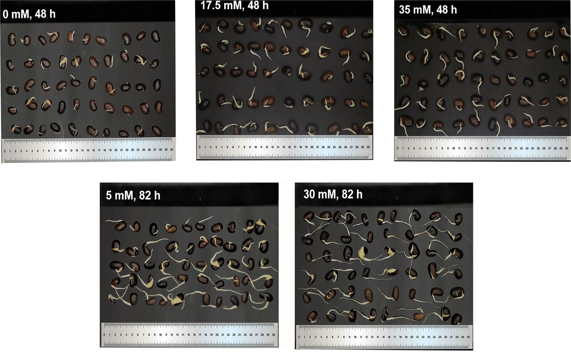 Appearance of runner bean sprouts at different germination times (48–82 h) after soaking in H2O2 solutions of varying concentrations (0–35 mM).