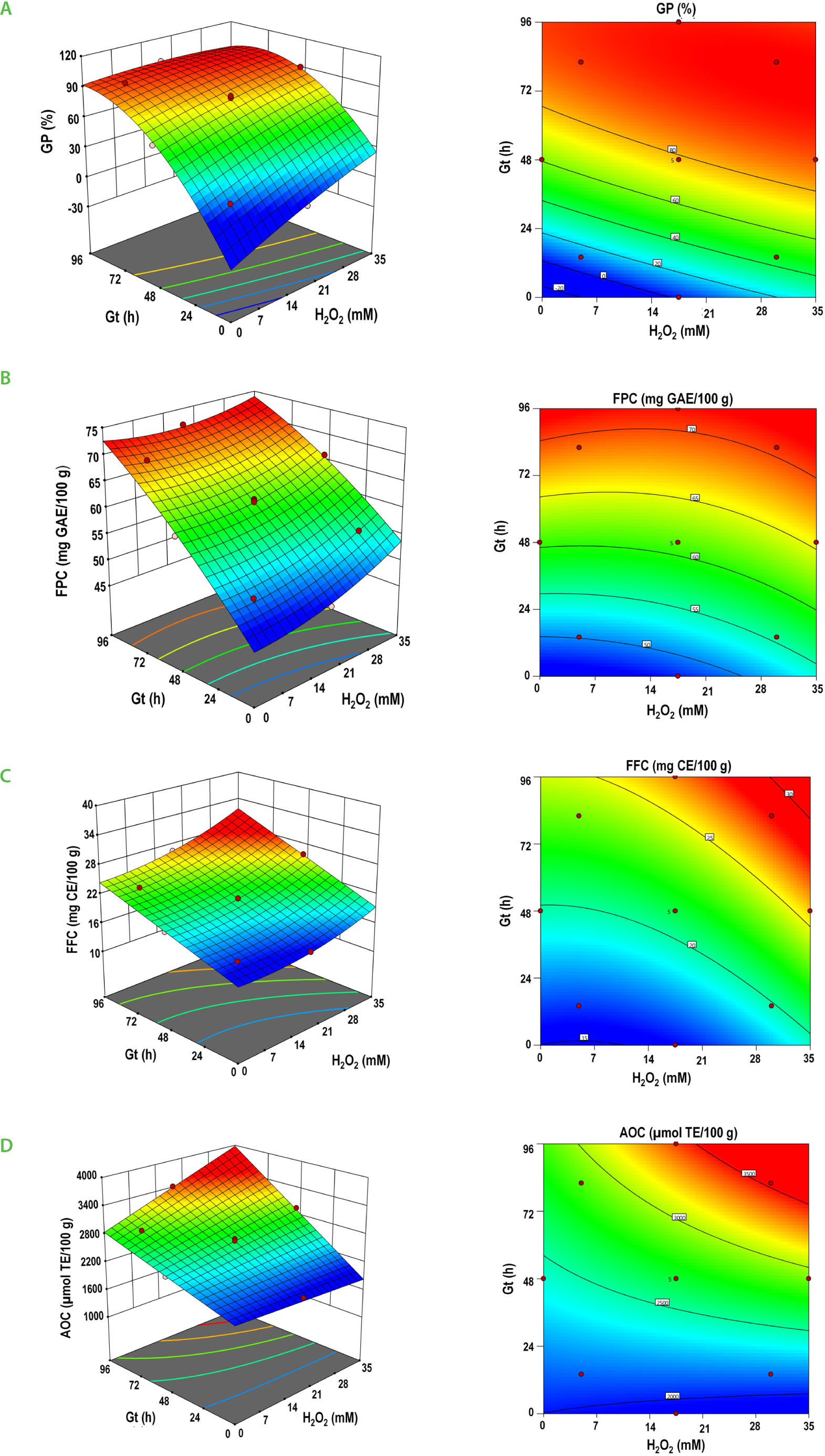 Response surface and contour plots for the effect of the soaking hydrogen peroxide concentration (H2O2), and germination time (Gt) on the response variables: (A) germination percentage (GP), (B) free phenolic content (FPC), (C) free flavonoid content (FFC), and (D) antioxidant capacity (AOC) of black runner bean sprouts.