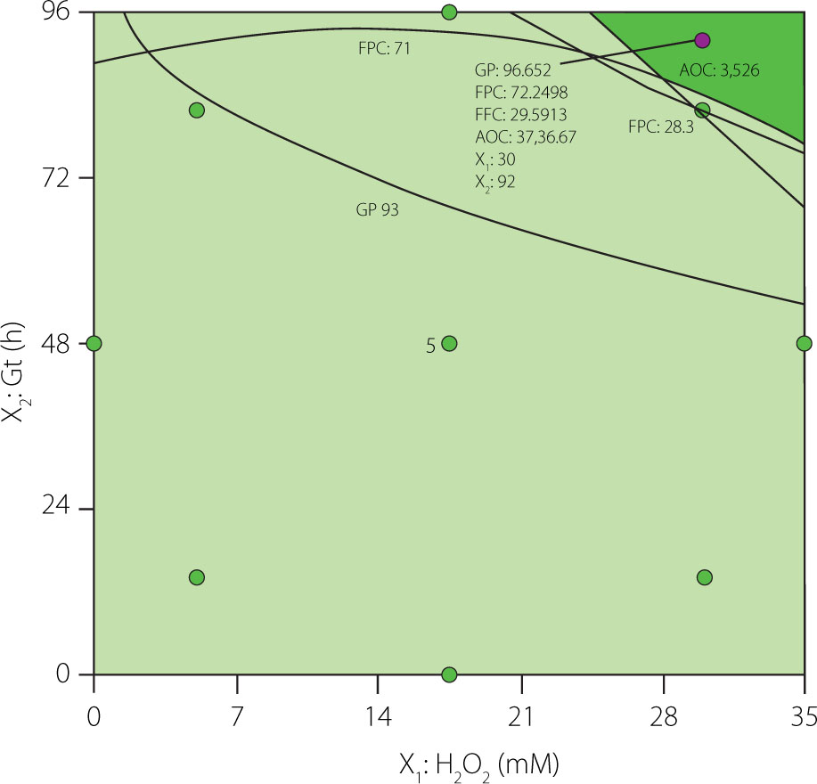For optimizing process conditions, the RSM was used through the graphical method to determine the optimal combination of the [H2O2] and Gt that maximize the values of the GP, FPC, FFC, and AOC in the sprouts. The overlaid contour plot (Figure 3) was used to determine the best combinations of the process variables. The dark green area shows the region with the best combination of process variables to achieve the highest levels of the four response variables, from which the optimal conditions of [H2O2] (30 mM) and Gt (92 h) were selected.