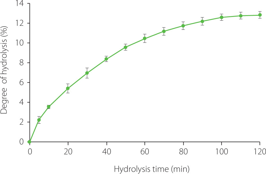 The hydrolysis was performed in triplicate and, based on mean DH in each hydrolysis time point, hydrolysis curve was plotted. To produce the hydrolysates, a series of hydrolyses were carried out under the same conditions of initial protein concentration of 10% (w/w), E/S of 15 mAU/ g, pH of 8.0, and temperature of 50°C. They were stopped after the time estimated based on the hydrolysis curve, necessary to produce hydrolysates at the DHs of 2%, 5%, 8%, and 12%. The enzyme was inactivated by heating the suspension at 75°C for 15 min. Then, the hydrolysates were neutralized with 1 M HCl solution and freeze-dried using Lyph Lock 6 system (Labconco, Kansas City, MO, USA).