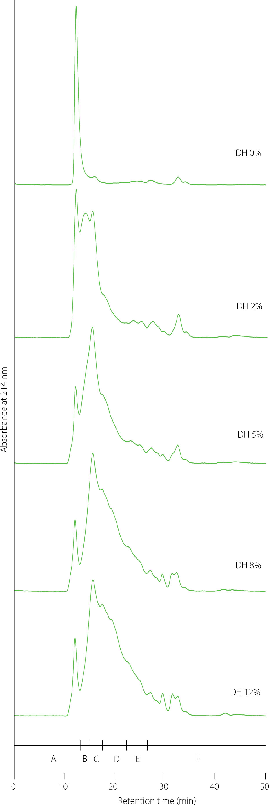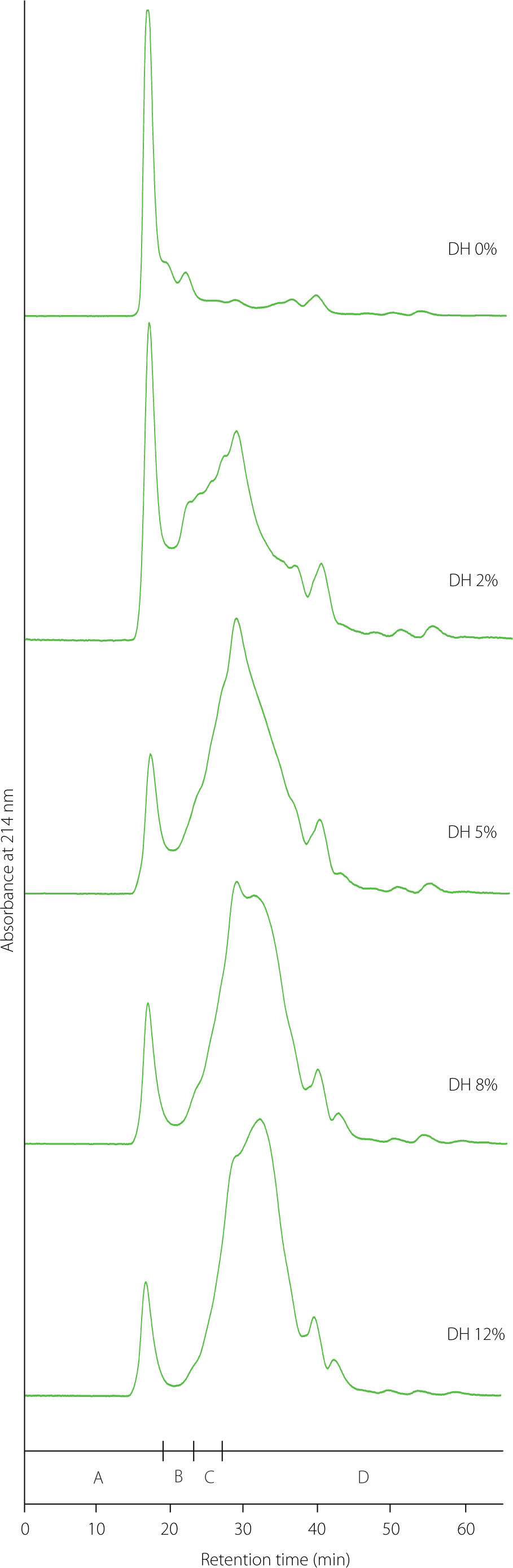 Size-exclusion chromatography separation of pea protein isolate (degree of hydrolysis, DH, 0%) and its tryptic hydrolysates (DH 2–12%) using a Superdex 75 column. Letters A, B, C, and D above x-axis indicate molecular weight ranges of >53, 29–53, 9–29, and <9 kDa, respectively.