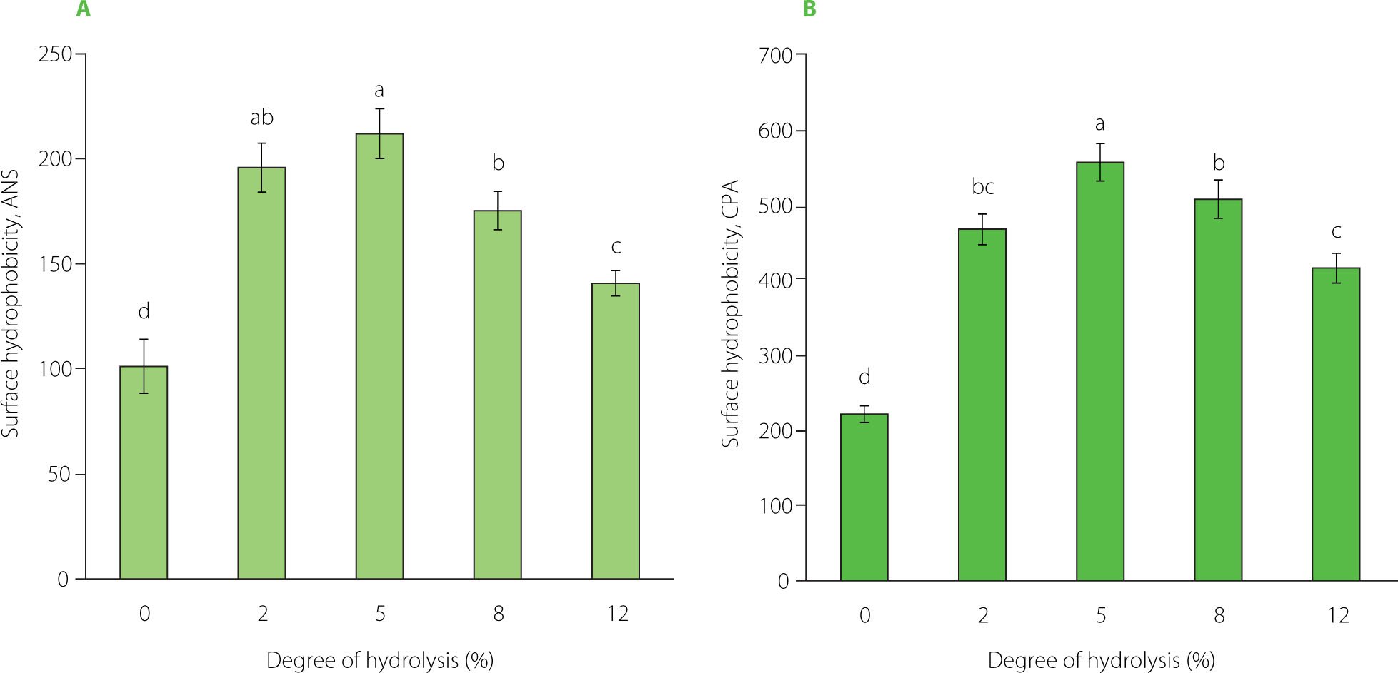 The surface hydrophobicity of the isolate and the individual hydrolysates determined by the ANS assay was lower than that shown by the CPA assay (Figure 4). The reason may be the specificity of the fluorescent probes. Although the reagents of both assays are anionic probes, ANS has an aromatic structure and CPA contains an aliphatic hydrocarbon chain; therefore, their binding sites on the protein may be different and, thus, may affect the measured protein hydrophobicity value [Alizadeh-Pasdar & Li-Chan, 2000]. Our study results indicated that the protein binding sites interacted more readily with aliphatic CPA than with aromatic ANS under assay conditions (pH 7.0). Alizadeh-Pasdar & Li-Chan [2000], who compared the surface hydrophobicity of a few proteins measured in both assays, showed that native β-lactoglobulin had higher hydrophobicity in the CPA assay than in the ANS assay (both performed at pH 7.0), but native and heated bovine serum albumin showed higher values in the ANS than in the CPA assay. Noteworthy is, however, that these differences varied depending on pH, and the authors concluded that the hydrophobicity was influenced not only by the structure of the fluorescent probe but also by electrostatic interactions in the measurements.