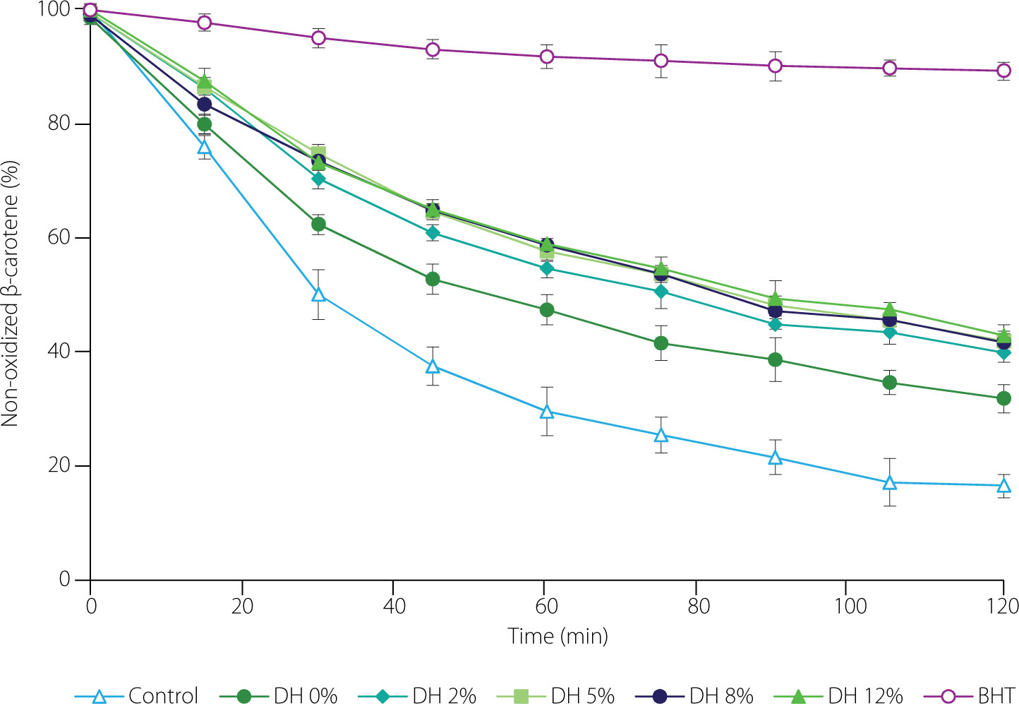 Inhibition of the β-carotene-linoleic acid emulsion oxidation by pea protein isolate (degree of hydrolysis, DH, 0%), its tryptic hydrolysates (DH 2–12%), and butylhydroxytoluene (BHT); Control, emulsion without antioxidants.