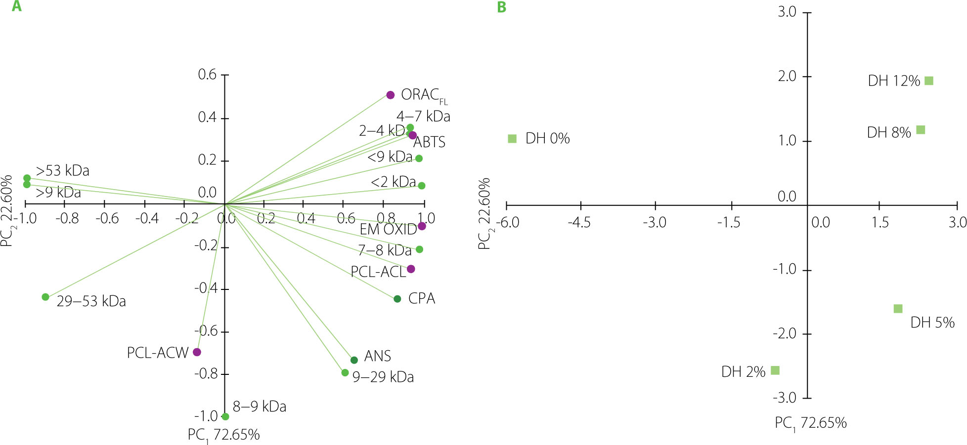 Plots of principal component analysis with (A) distribution of the variables including surface hydrophobicity (measured in the assay with 8-anilino-1-naphthalenesulfonic acid, ANS; and cis-parinaric acid, CPA), relative content of fractions with different molecular weight (MW) and antioxidant capacity (determined as 2,2’-azino-bis(3-ethylbenzothiazoline-6-sulfonic acid) radical cation scavenging capacity, ABTS; oxygen radical absorbance capacity, ORACFL; antioxidant capacity of water-soluble and lipid-soluble compounds in the photochemiluminescence assay, PCL-ACW and PCL-ACL, respectively; and inhibition of β-carotene-linoleic acid emulsion oxidation, EM OXID), and (B) distribution of pea protein isolate (degree of hydrolysis, DH, 0%) and its tryptic hydrolysates (DH 2–12%).